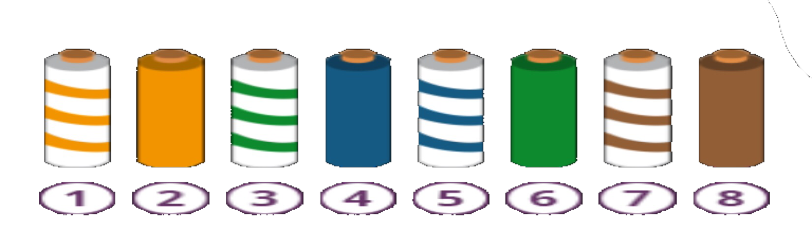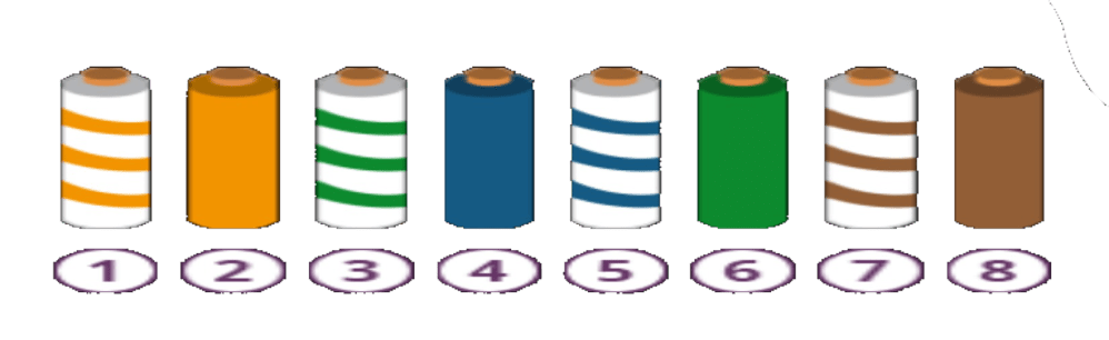 Les quatre couleurs de fils sont: bleu, orange, marron et vert. Chaque paire dispose d’un fil de couleur unie et d’un autre rayé de la même couleur. (voir schéma ci-dessous)