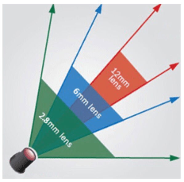 Le choix de l’objectif s’exprime principalement en “focale” ( c’est à dire en mm ), ceci permet de déterminer le champ de vision ainsi que l’angle de vision.